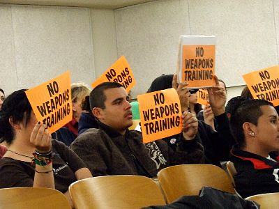 For instance, when I tell people that in San Diego the JROTC has built and is building firing ranges at San Diego high schools, most people react with almost pure shock. Although these firing ranges aren't using real weapons, but just air powered rifles, the idea that young high school students are being trained to handle weapons, forces people to recognize not just the violent aspects of militarism, but more so the predatory aspects of it, which we see through the recruitment of students at increasingly young ages in order to meet recruitment targets.